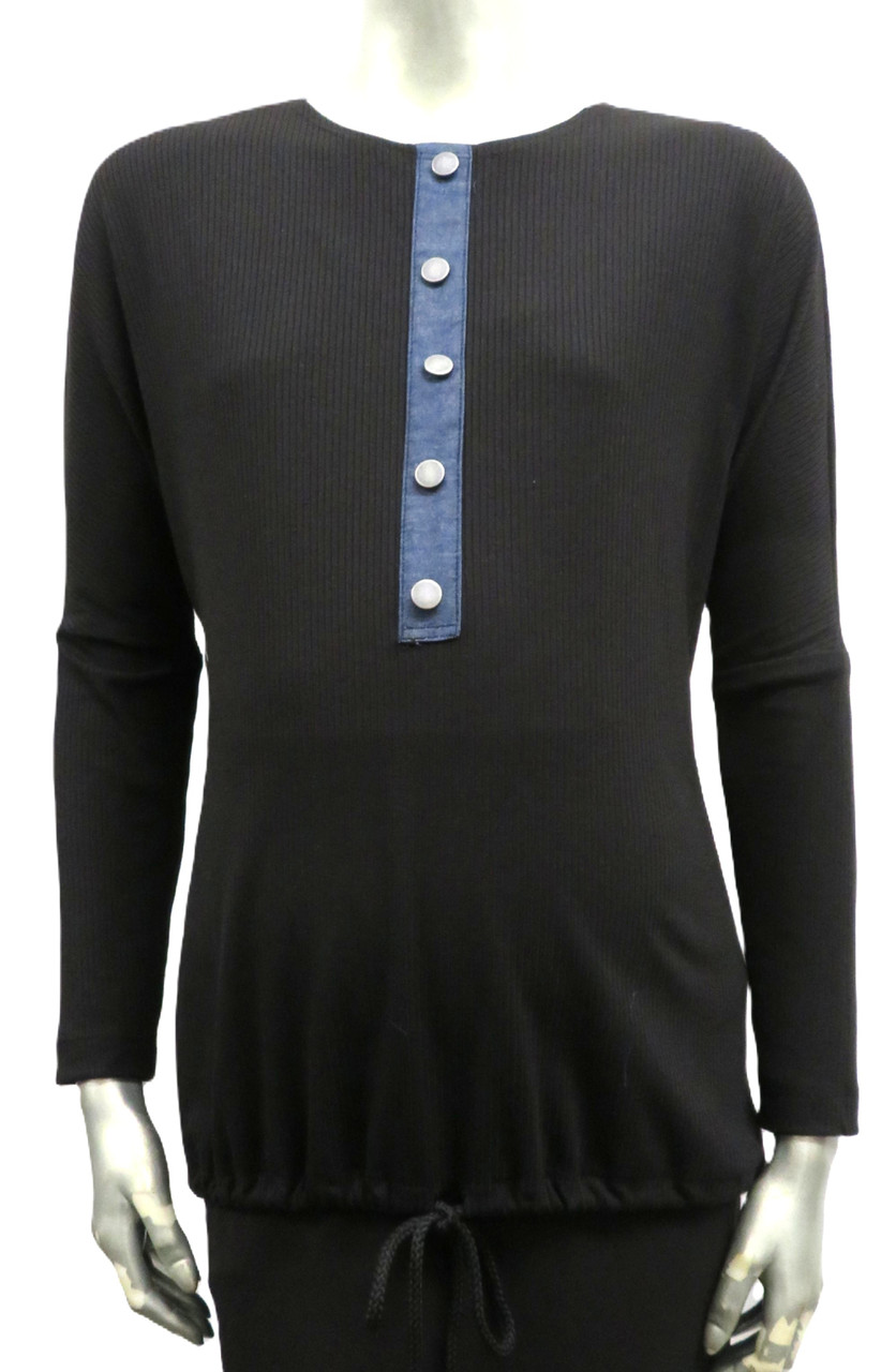 Henley top with denim placket and tie at the waist